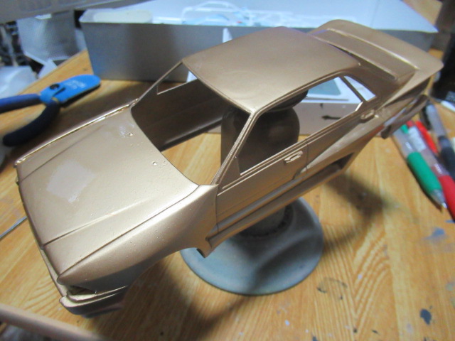 ボディはほぼ完成しました。今現在でもウレタンクリアー層はベタベタしていて、やはり研ぎ出しは無理のようです。もう諦めました。なので、窓枠やフロントの部分をエナメル塗料のブラックで筆塗りし、あとは窓のクリアーパーツとライト類を接着させれば完成です。