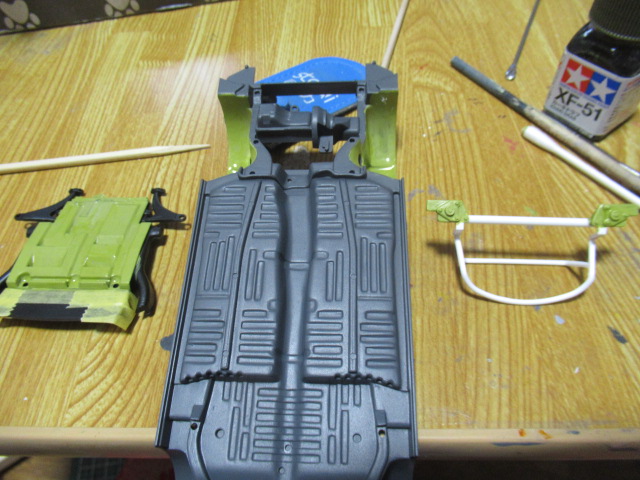 とりあえず混色したエナメル塗料で筆塗りをしました。案外と隠ぺい力が低いのかブラックの上に塗るのはなかなか大変な作業で何度も重ね塗りをしました。元来、乾くのが遅いのが筆塗りに適しているとされるエナメル塗料ですが、乾燥が十分でないと筆で塗膜を引っ搔くことになるので失敗してしまいました。あんまりエナメル塗料を広い面に使う機会は無いのでそれなりに苦戦しました。筆塗りするならばアクリジョンの方が良い感じではあります。タミヤの水性塗料でもいいかもしれません。