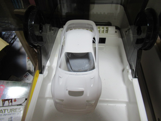 さっそく、ホワイトで吹いてみました。今回使用したホワイトは、クレオスのGGXホワイトです。専用のうすめ液で希釈して使いましたが、GXクールホワイトと比べていないので分かりませんが、発色は良い様いです。