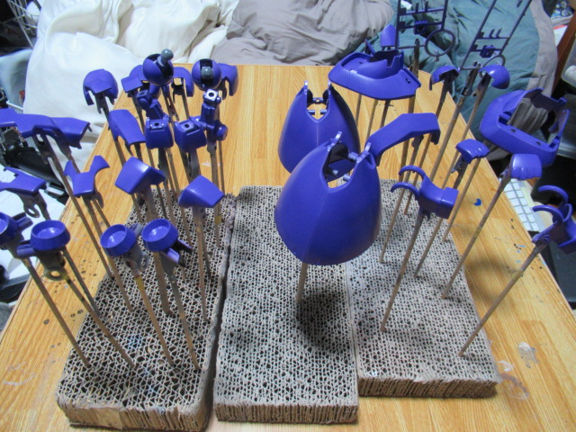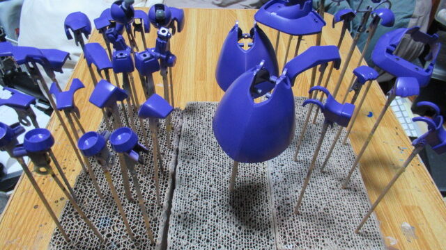 まずは、薄紫のパーツからですが、いったんグレーのサーフェイサーを吹いた後にパープルを下地色として吹き付けました。今日、ホワイトとパープルと少量のブラックを混色したカラーでグラデーション塗装に挑戦したいと思います。果たしてどんな結果になるのか楽しみですが、この塗装で学んだのは、今さらですが塗料をうすめ液で気持ち多めに薄めてエアーを弱めにしてエアブラシのトリガーも1/3くらい引いて吹くと塗料もそんなに使わなくて済むしムラも出にくいというのを学びました。今まで強く吹きすぎていたんですね。